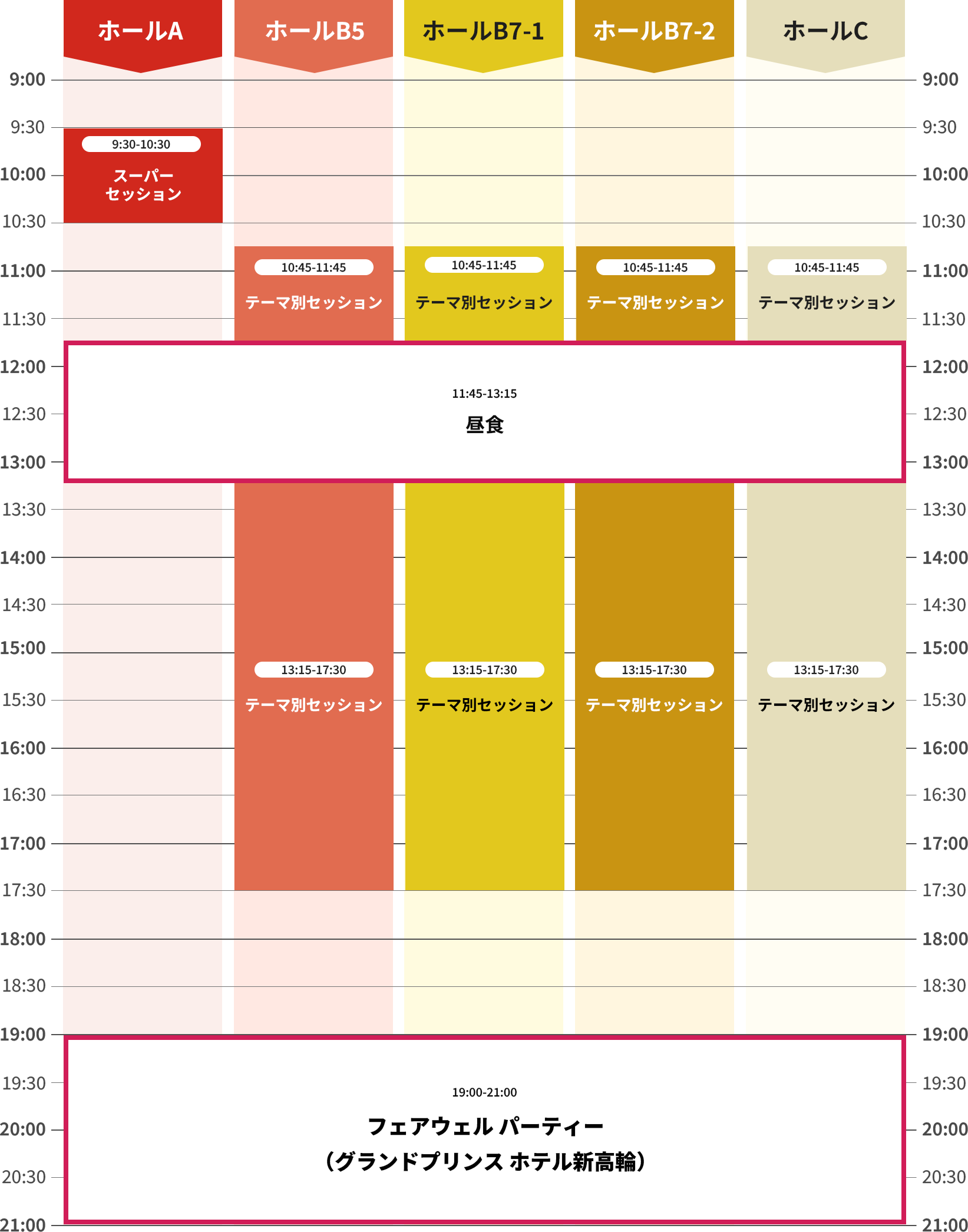 スーパーセッションで始まり、前日と同様に4つの会場に分かれ、5つのテーマ別セッションを実施します。(東京国際フォーラム)